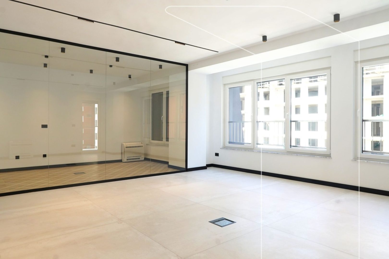 Zyra ndodhet në katin e 12-të, me orientim lindje-perëndim, që siguron ndriçim natyral gjatë gjithë ditës dhe një ambient pune komod.